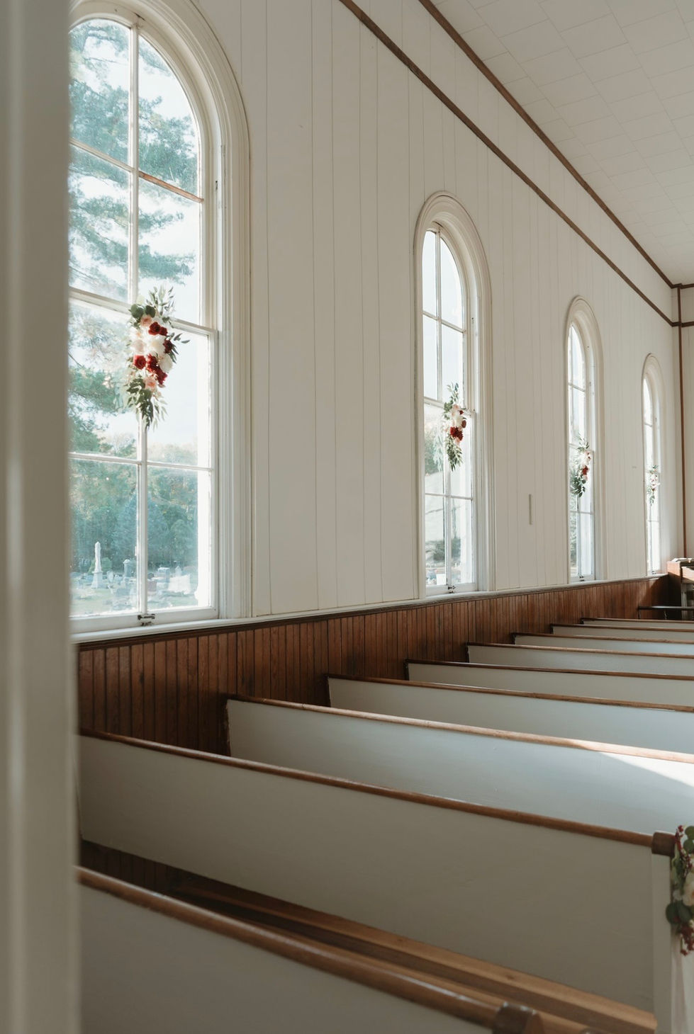 This project showcases the elegant and simple interior and exterior decorations of a wedding chapel. From the floral cross decorations to the crystal glass and lace tablecloth, these images capture the beauty and serenity of a wedding chapel.
